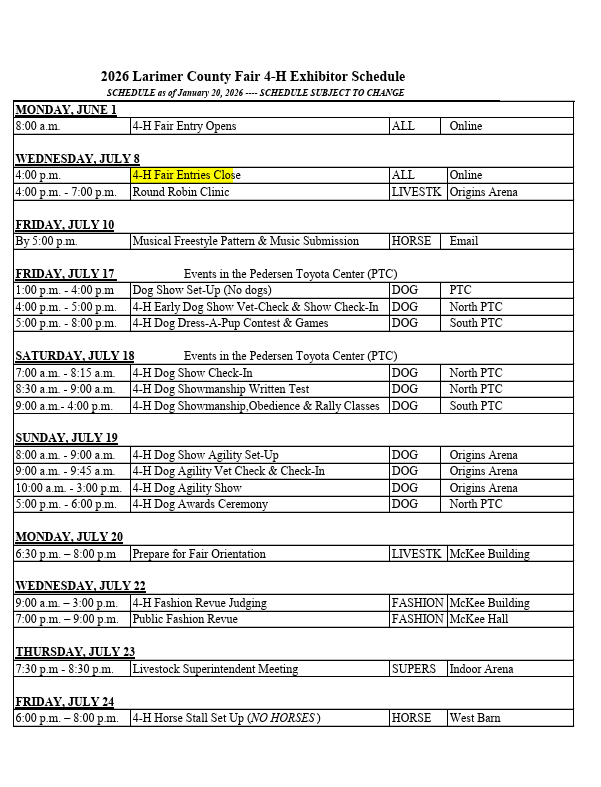2026 4-H Livestock & General Projects Schedule